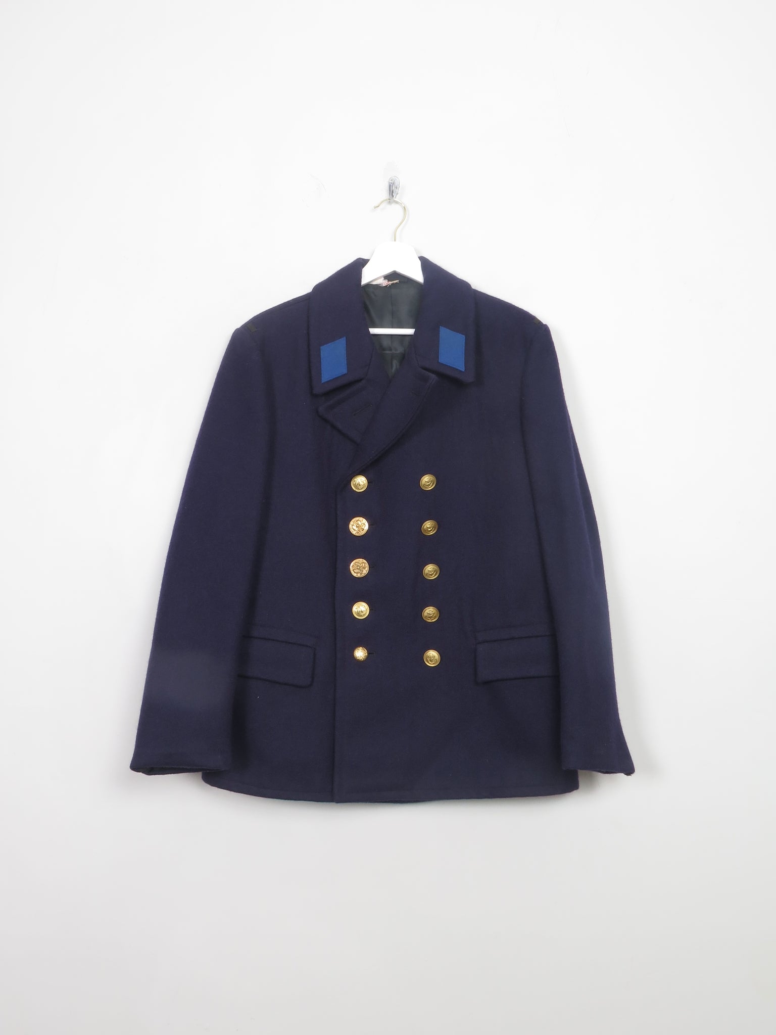 Men's vintage navy military jacket 40" This authentic vintage military wool jacket exemplifies timeless tailoring and enduring craftsmanship. Constructed from substantial wool fabric, the jacket delivers warmth and structure with a distinctly military aesthetic. The lined interior provides additional comfort and durability, while the classic cut suits both period-accurate styling and contemporary wardrobes. The navy colourway offers versatility across seasons and occasions, from casual wear to curated vintage ensembles—an investment piece for those who appreciate genuine military heritage and quality construction.