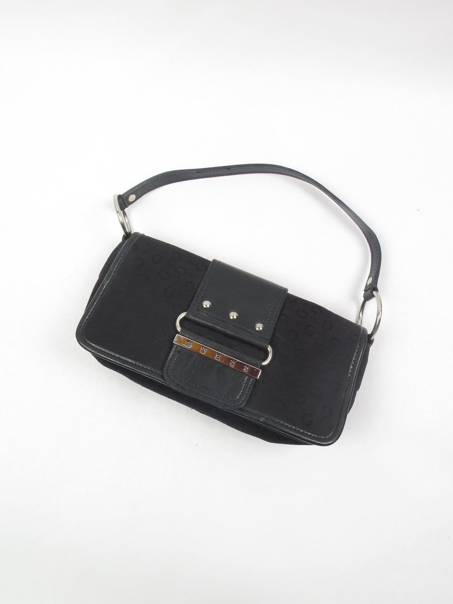 Elevate your everyday carry with this authentic vintage Guess shoulder bag in classic black. Crafted with meticulous attention to detail, this compact silhouette features the iconic silver hardware that defined the brand's golden era. The monogrammed design embodies timeless sophistication, while the structured shape strikes a balance between style and practicality. A coveted piece for collectors and vintage enthusiasts alike, this bag seamlessly transitions from day to evening, offering the coveted pre-loved luxury aesthetic that can only be replicated by pieces of a bygone era.