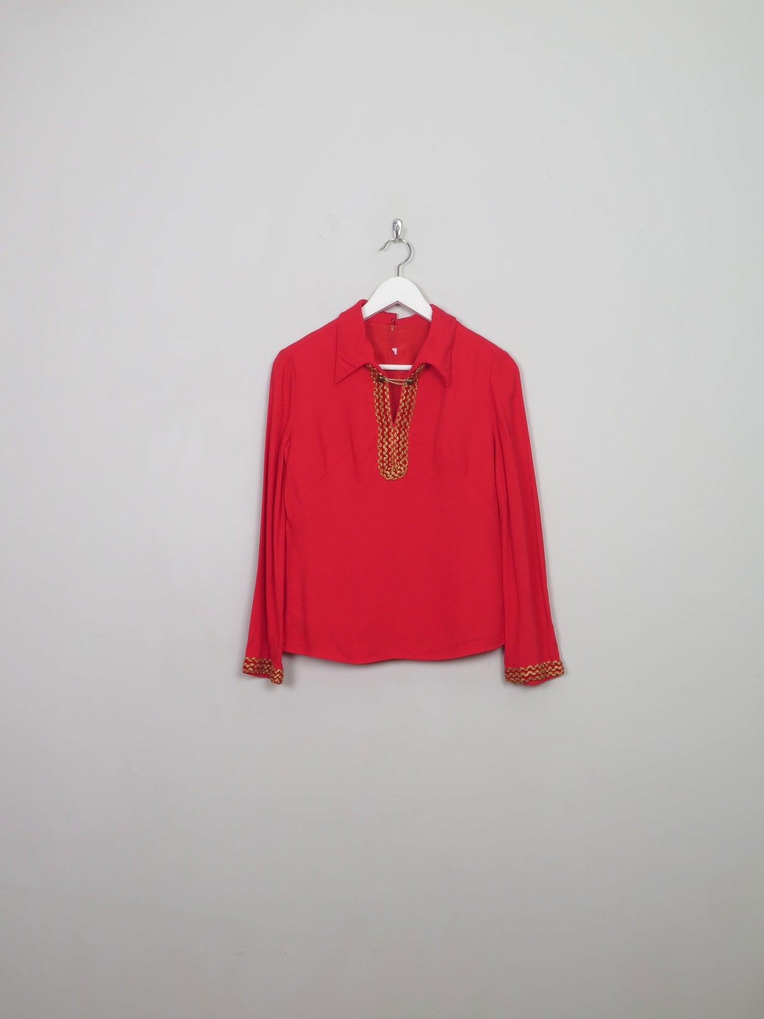 This vintage red top from the 60s features a classic collar, lined interior, and gold braid detailing. The slightly flared sleeves add a touch of elegance to this timeless piece. Perfect for adding a vintage touch to any outfit.