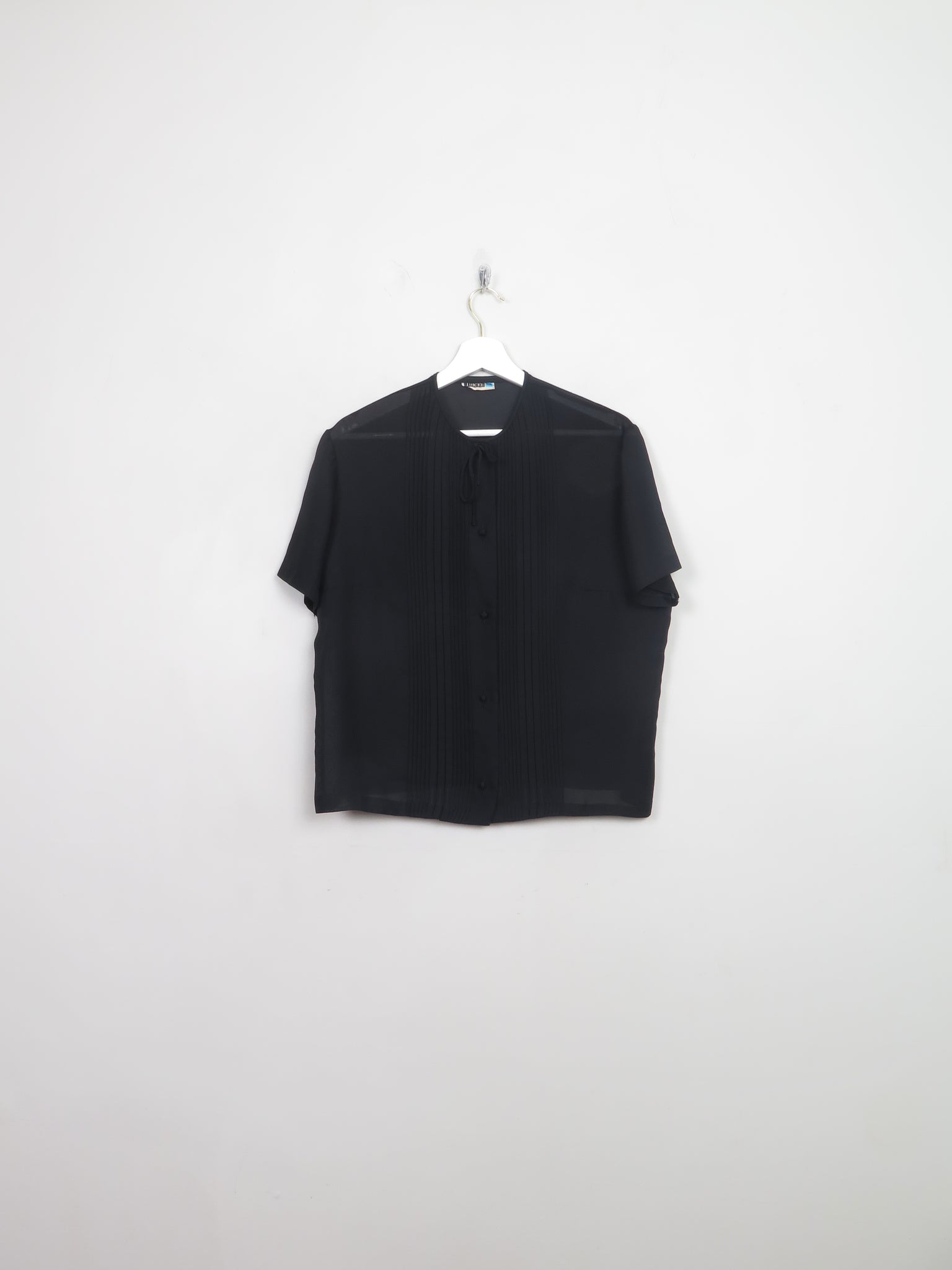 Timeless black pleated blouse featuring a classic button-up front and elegant tie neck detail. Short sleeves offer versatile styling for both professional and casual settings. The structured pleating adds sophisticated texture and dimension to this wardrobe essential. Perfect for layering or wearing standalone, this vintage-inspired piece delivers refined elegance with practical everyday wearability.