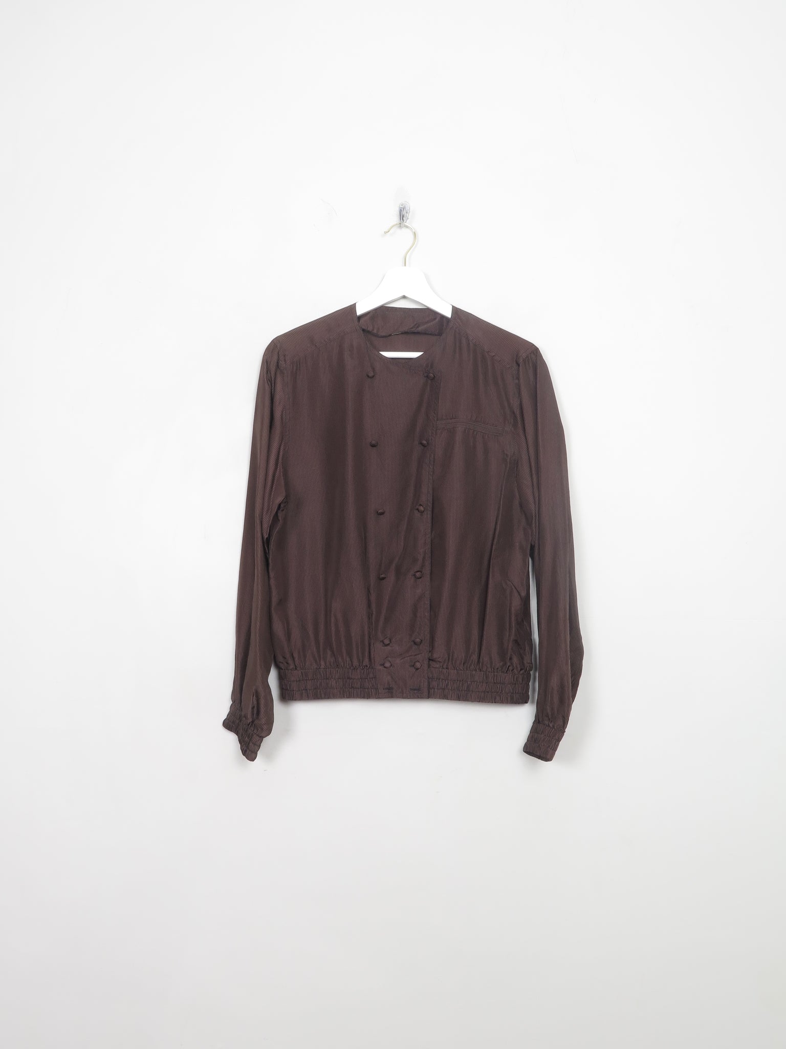 This vintage 80s blouse captures the era's distinctive style with its double-breasted front and slightly cropped silhouette. Crafted in rich brown tones, it features long sleeves finished with elastic trims for a refined fit at the wrists. The collarless neckline offers a modern edge, while a functional pocket adds practical appeal. Perfect for layering or styling as a standalone piece, this size S blouse brings authentic retro charm to contemporary wardrobes.