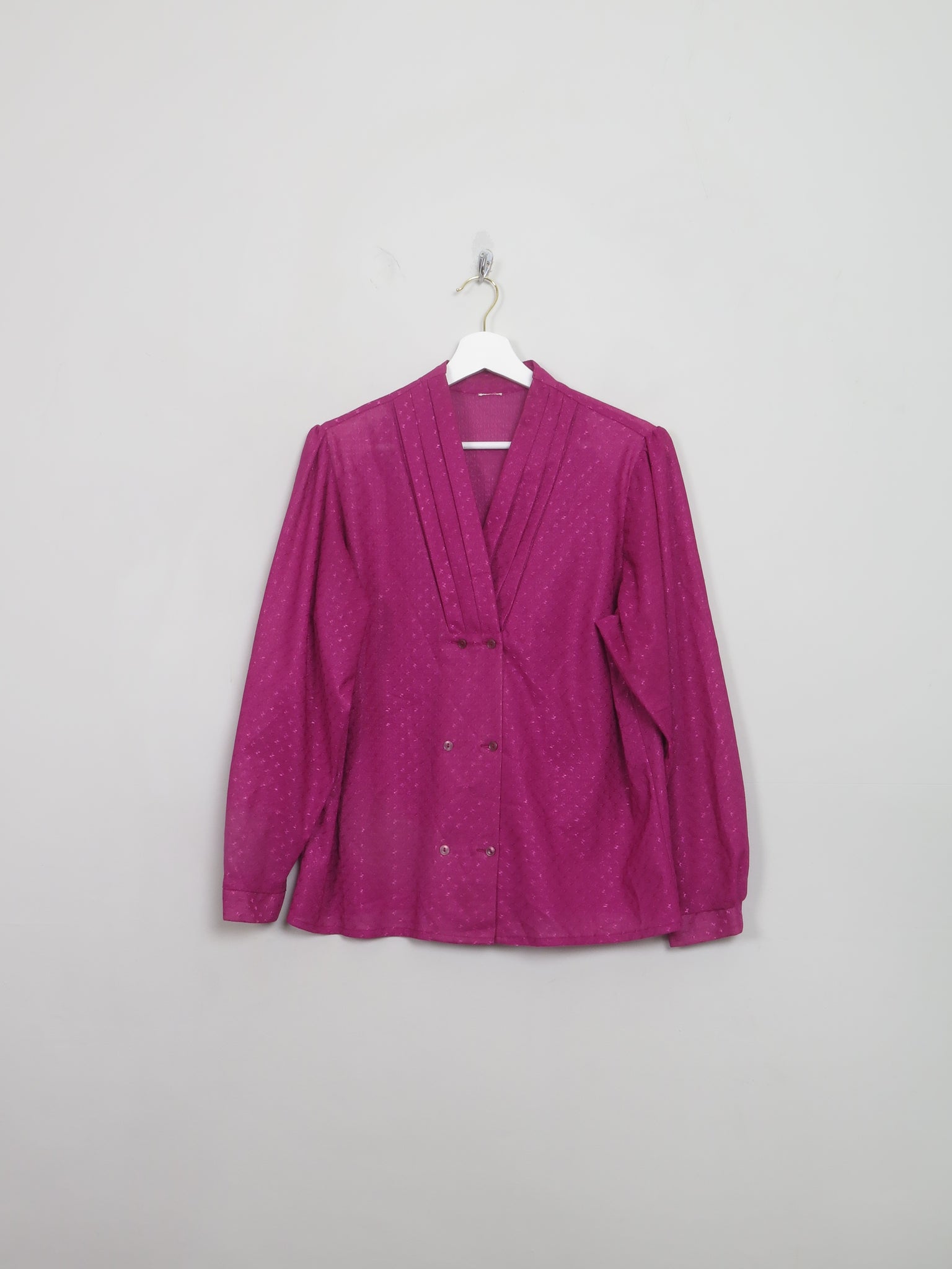 This vintage cerise pink long-sleeved blouse in size L features a vibrant hue that brightens any wardrobe. The elegant V-neck is enhanced with delicate pleating around the neckline, adding texture and sophistication. Crafted with a jacquard weave, the blouse showcases an all-over intricate pattern that elevates its vintage appeal, making it a refined choice for both professional and casual settings.