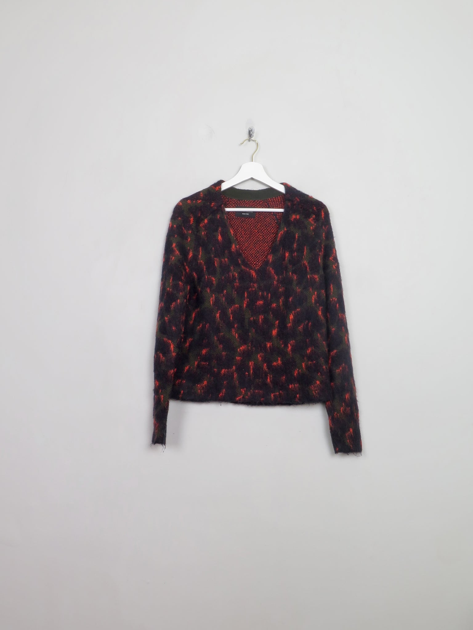 This luxurious V-neck jumper combines sophisticated design with premium comfort. Crafted from sumptuous mohair-wool mix, it delivers a soft, lightweight feel while maintaining excellent shape retention. The fitted silhouette flatters the figure, creating an elegant line perfect for layering or wearing solo. The striking leopard print pattern showcases a captivating blend of coral, purple, and navy tones—a refined colour palette that transitions seamlessly from season to season. An investment piece that elevates any wardrobe with understated glamour and timeless appeal.