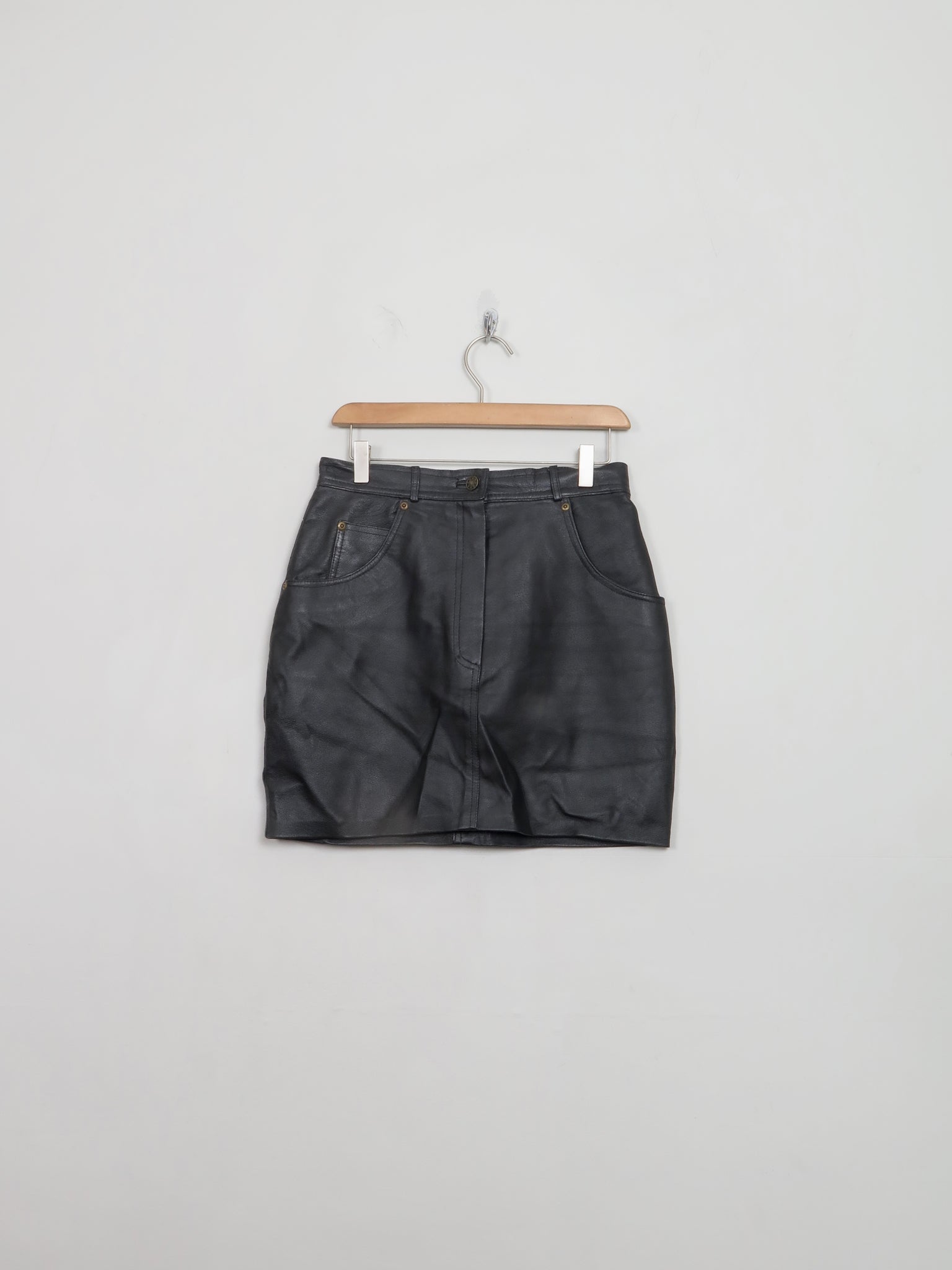 This vintage black leather mini skirt features a sleek, lined interior for comfort and durability. Designed with a button-front closure, it offers easy wear and a timeless look. Practical side pockets add functionality without compromising style. The skirt's neat tailoring ensures a polished silhouette, making it a sophisticated addition to any wardrobe.