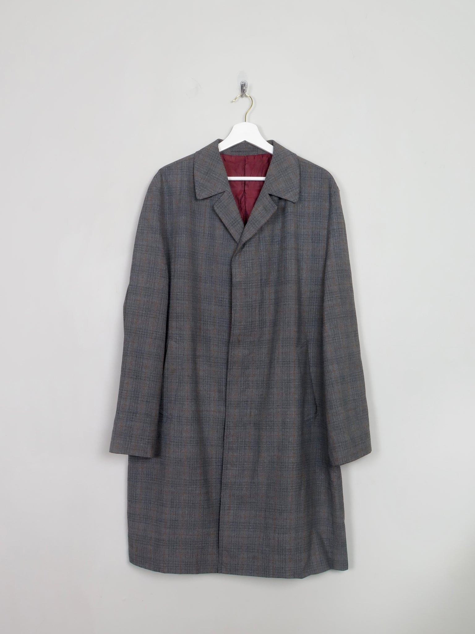 This men’s trench-style grey check overcoat, in size L, offers a relaxed fit designed for comfortable layering. Fully lined for added warmth and smooth wear, it features a small slit at the back to enhance movement while maintaining a polished silhouette. Combining classic check pattern with practical details, this overcoat provides both style and functionality for cooler days.