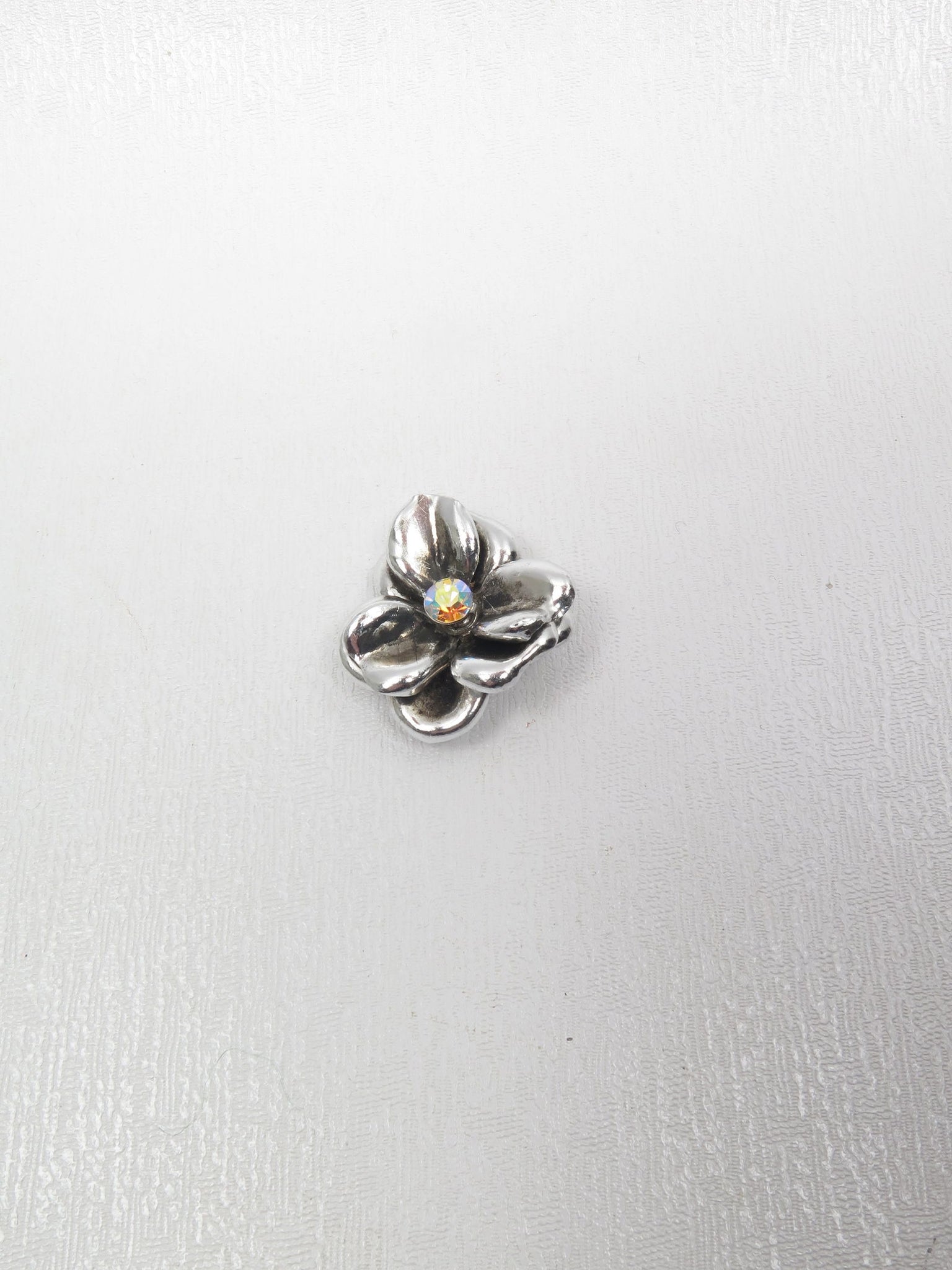 Expertly crafted with vintage silver metal, this stunning floral brooch features a sparkling rhinestone at its centre . Elevate any outfit with this elegant and timeless accessory, perfect for adding a touch of glamour and sophistication.