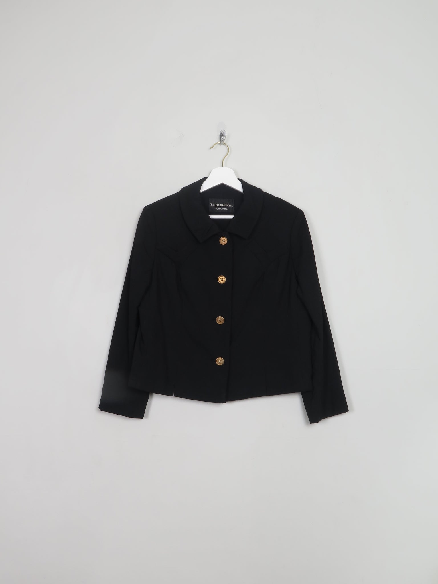 This vintage 1960s women's black wool jacket is expertly tailored with a slightly cropped silhouette and elegant 3/4-length sleeves. Fully lined for comfort and durability, it features refined detailing that highlights its classic design, making it a timeless addition to any wardrobe. Made in the USA from a high-end department store called L.L. Berger based in Bufflao NYC.