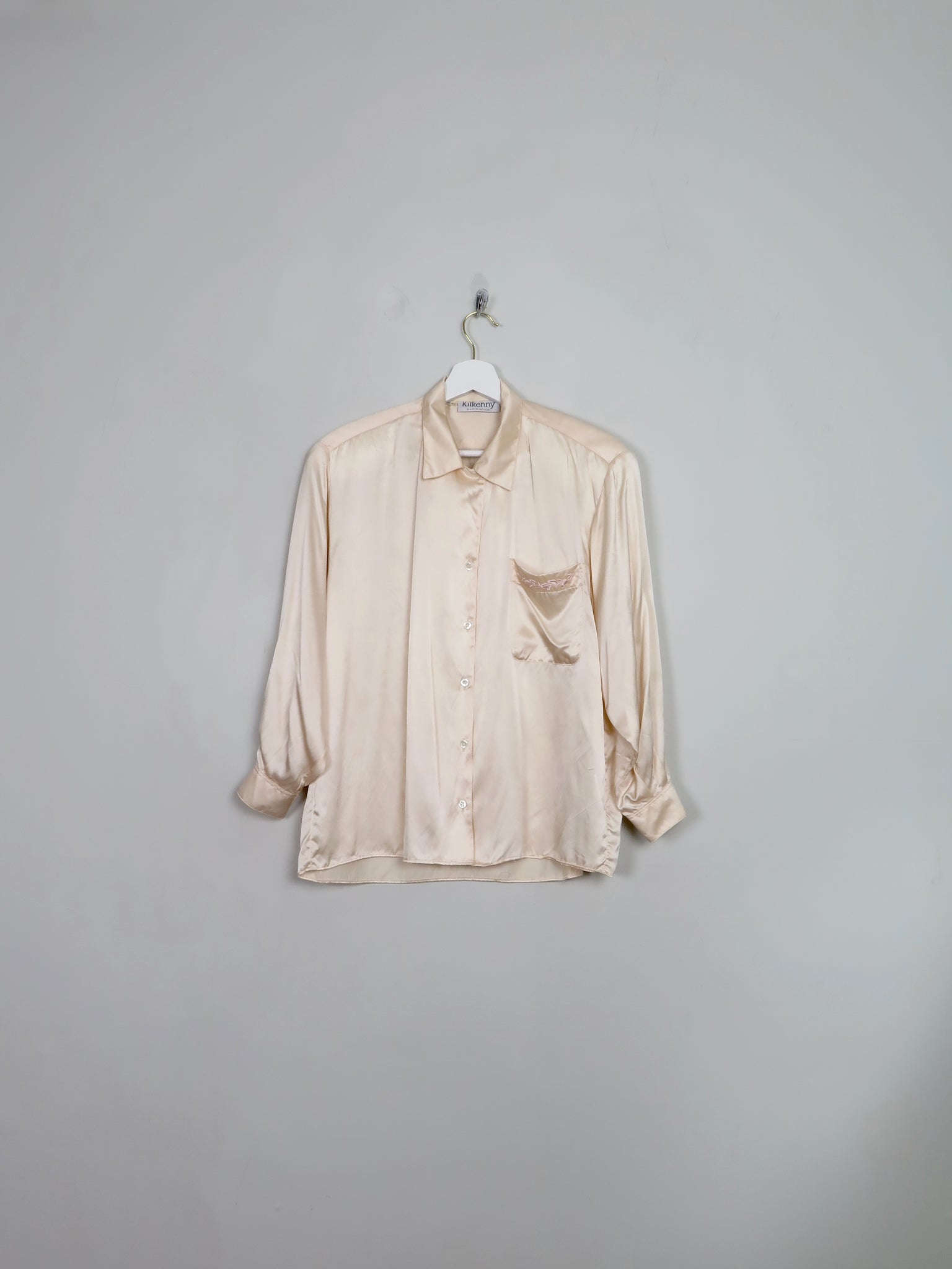 Elevate your wardrobe with this women's vintage peach silk, styled to evoke the charm of 1940s pyjama tops. Featuring structured shoulder pads and slightly cropped sleeves, it offers a flattering silhouette that balances vintage elegance with modern comfort. The peach silk fabric provides a soft, luxurious feel ideal for both casual and dressier occasions. Perfect for those seeking a sophisticated retro-inspired look with expert craftsmanship.